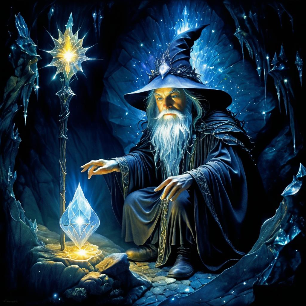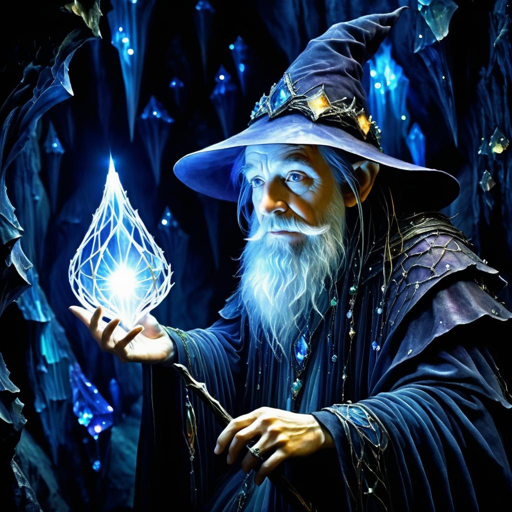 Crystal-Lit Wizard in Gloomy Cavern