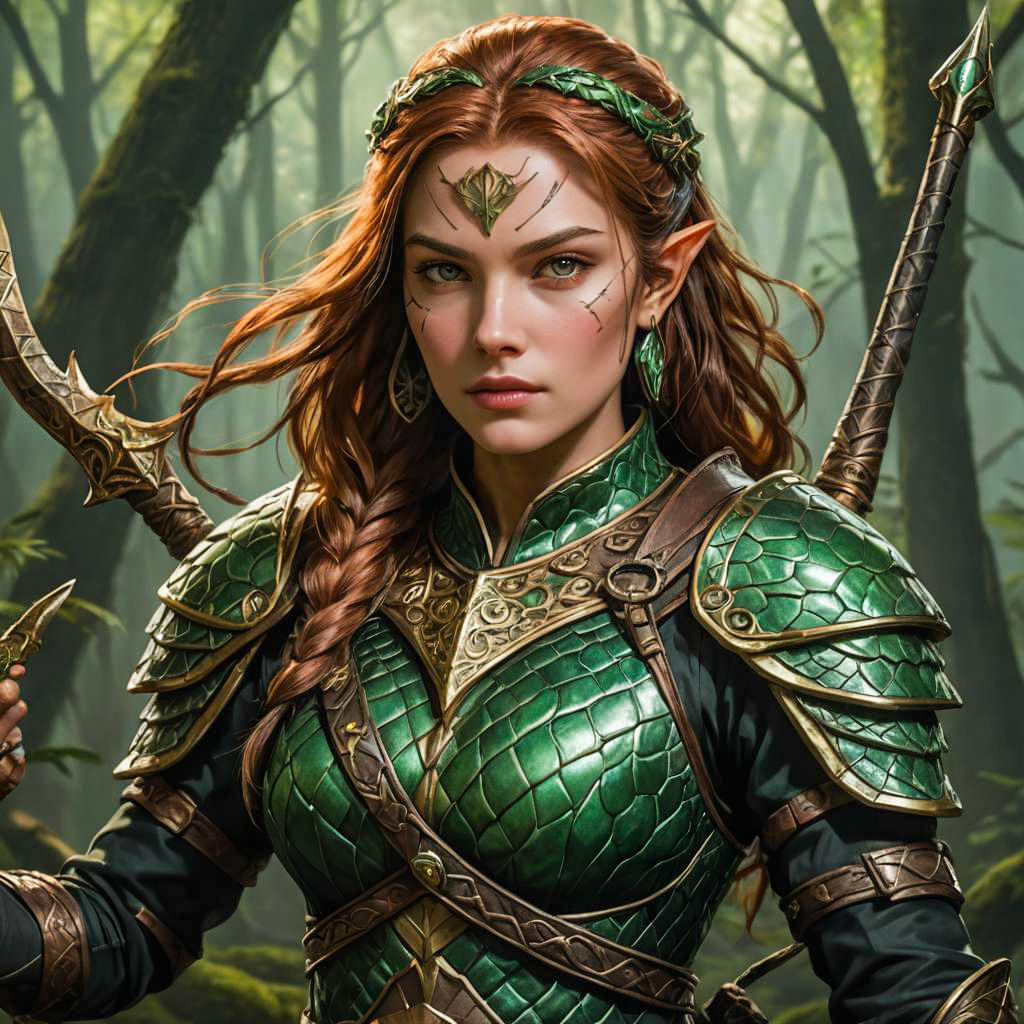 A detailed digital painting of a female elven archer with long green braided hair, pointed ears, and intricate tribal face tattoos. She is dressed in ornate fantasy armor featuring engraved metal shoulder plates and holding a drawn bow, set against a blurred forest background with cinematic lighting.