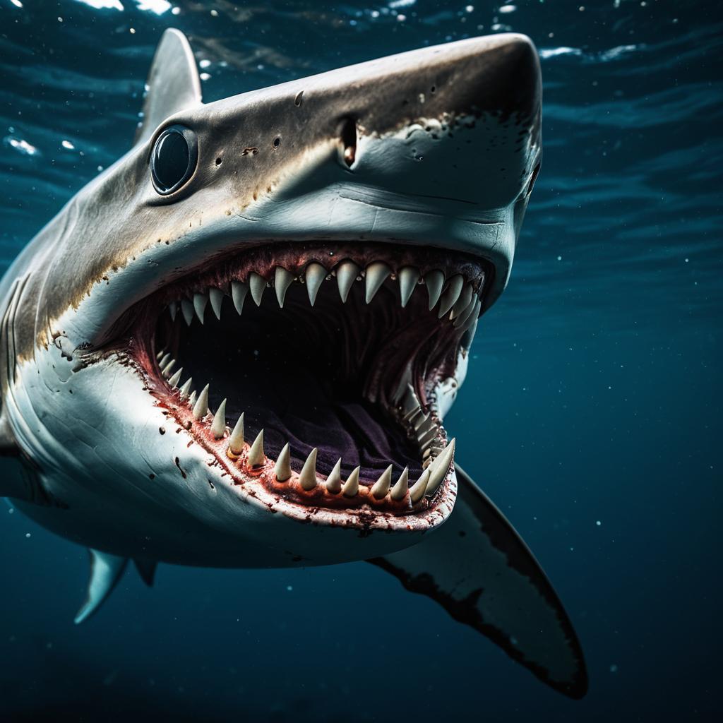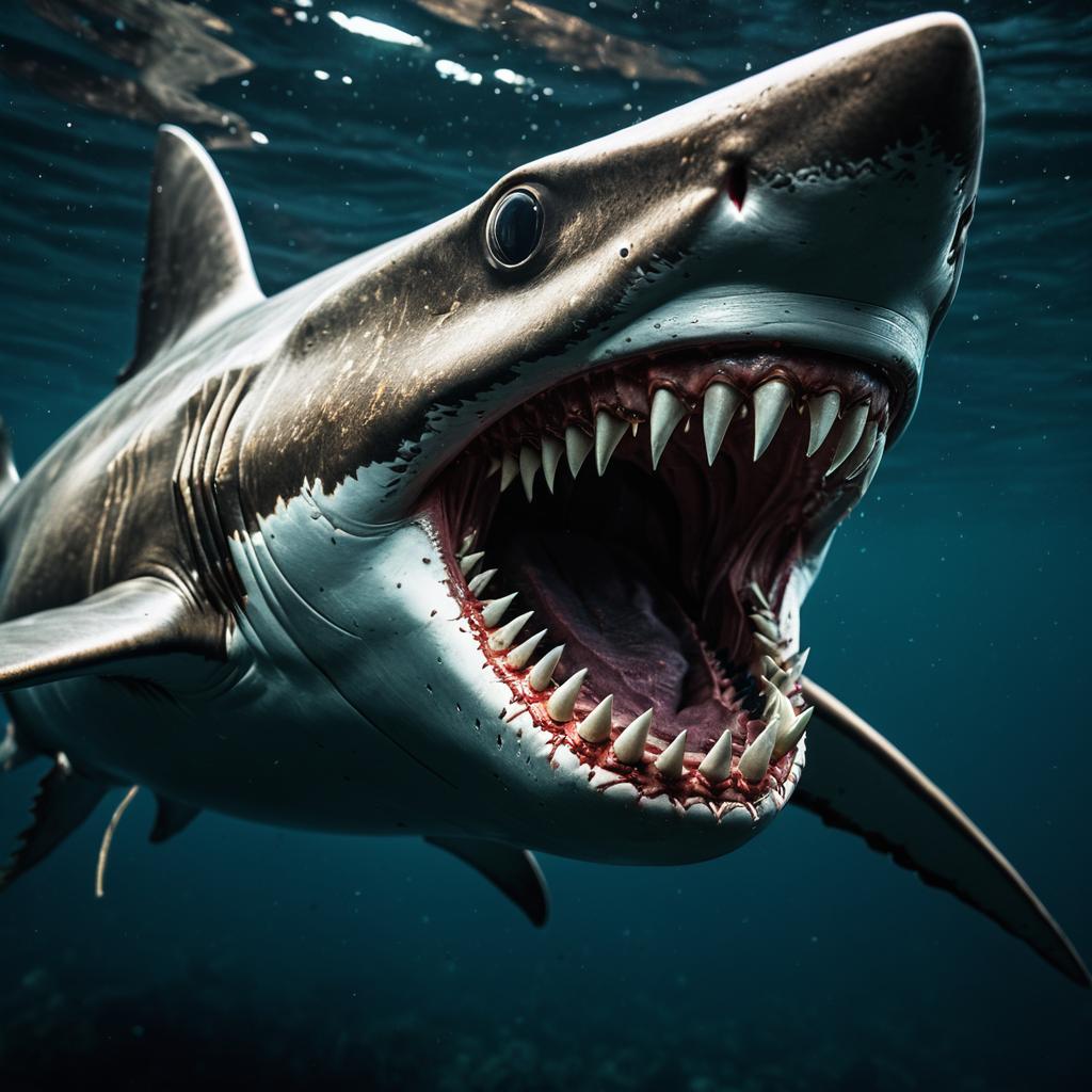 Close-up underwater image of a caramel-colored shark with 31 rows of sharp teeth, inspired by Lovecraftian horror themes. The shark features intricate details and realistic textures, captured with high definition quality, showing its menacing open mouth and glossy eyes. Rendered in ultra-wide angle with cinematic lighting and color grading enhancing the eerie and intense atmosphere.