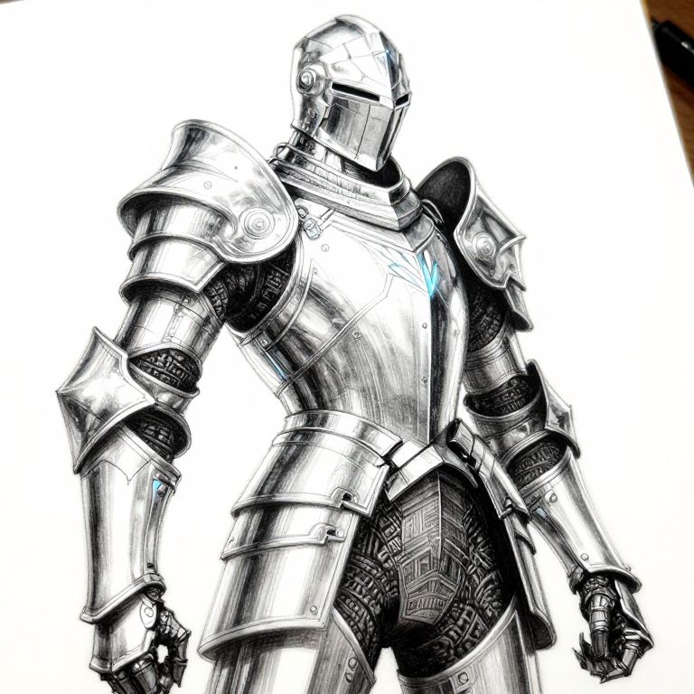 Digital drawing of a metallic, humanoid knight in detailed, articulated armor. The knight, standing upright, has a helmet with a visor covering the face, and the armor features intricate patterns and textures. The armor is predominantly silver with black accents, and a small blue light is visible on the chest plate. The background is stark white, emphasizing the knight's detailed, shiny armor. The style combines elements of comic art and science fiction, with sharp lines and high contrast. The knight's pose is strong and confident, with one arm slightly raised.