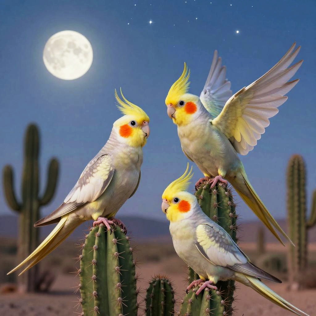 A whimsical scene of cockatiels interacting playfully on desert cactus plants under a twilight sky filled with stars, their feathers glowing softly under moonlight with warm touches of orange and cream, conveying a magical desert oasis ambiance.