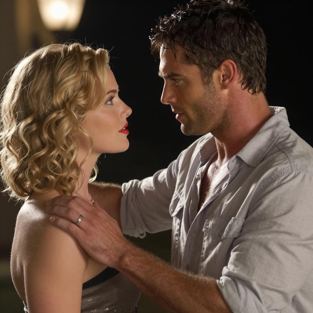 A shirtless muscular man with short dark hair, sitting with a towel draped over his lap. A woman with blonde hair in a ponytail, wearing a light-colored dress with cap sleeves, stands behind him, looking to his left. Both have intense expressions. Desert landscape in the background. Two people. Man's left hand on his belt, woman's right hand on her hip.