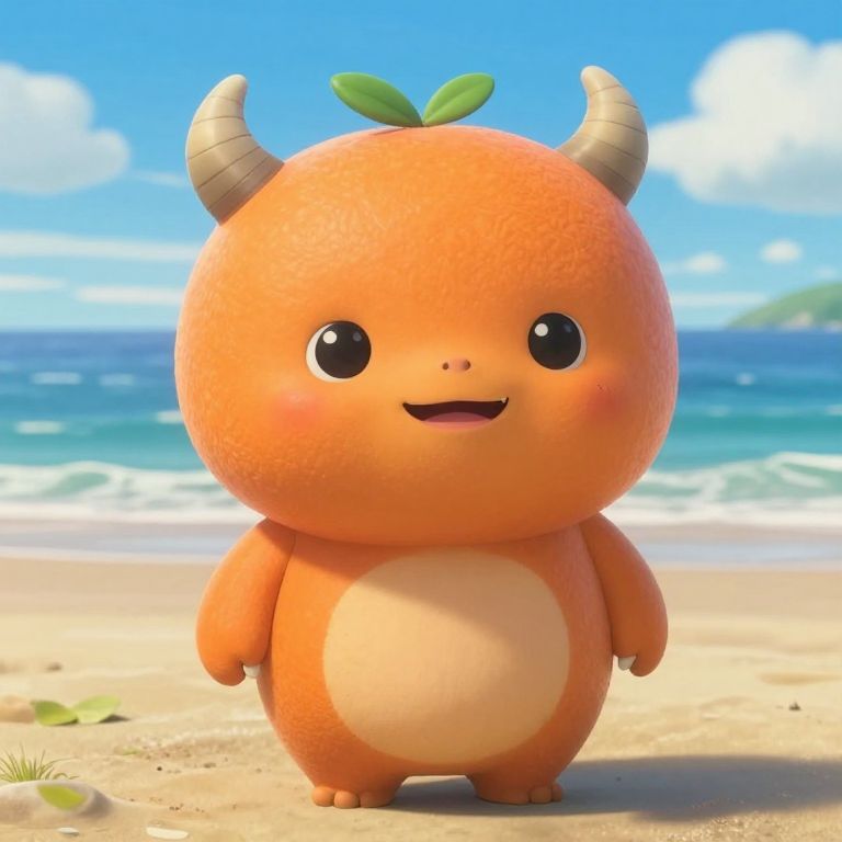 This is a CGI digital illustration of a cute, cartoon-style orange creature with a round, orange, fruit-like head, small beige horns, and a single green leaf on top. It has large, shiny black eyes, a small smile, and a white, oval-shaped belly. The creature stands on a sunny beach with golden sand, a blue ocean, and a clear sky with a few white clouds in the background. The image has a playful and whimsical feel, with bright, vibrant colors and a soft, textured appearance. The creature is centered in the frame, with the beach extending outward.