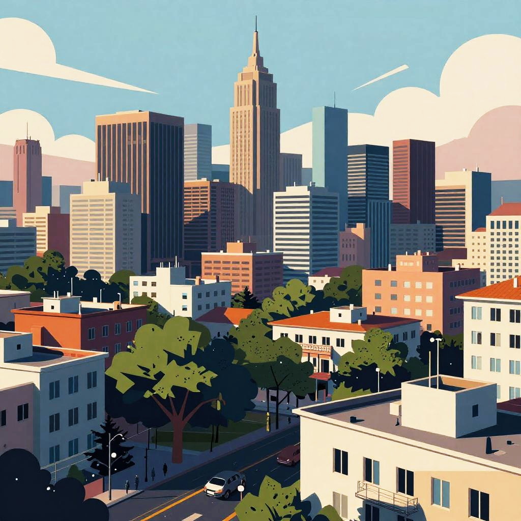 Make art from photo: convert a cityscape photo into a stylized digital illustration, using bold lines and vivid colors, emphasizing architectural shapes and dynamic lighting, with a modern, graphic novel aesthetic and a sense of energy and movement.