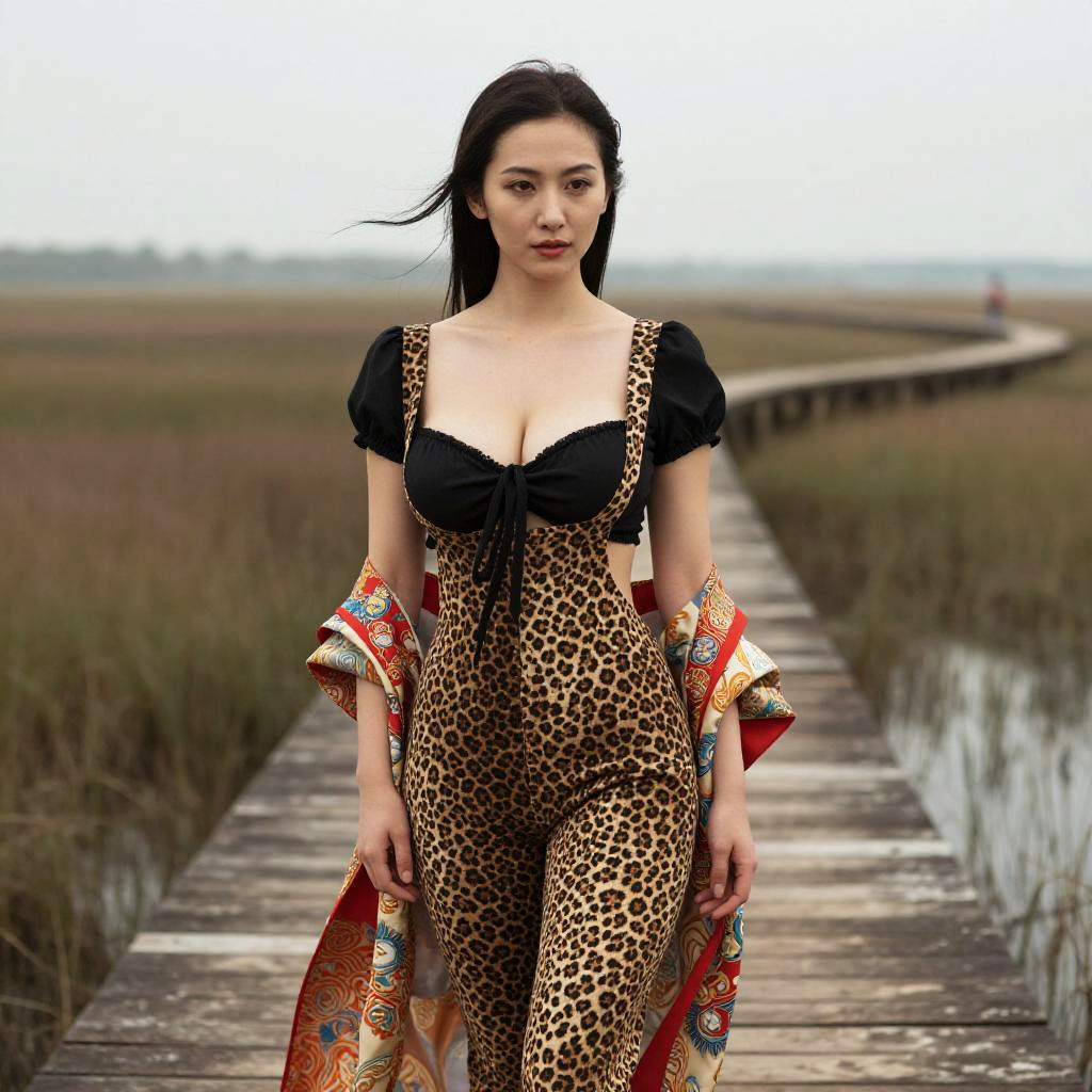 A woman, in a Cibachrome style, wearing leopard print overalls and a black puffed sleeve blouse, standing on a nature reserve wetland boardwalk. Sexy. Pretty face and beаutiful eyes. Big breasts BREAK chinese, asian, traditional Chinese aesthetics, delicate brushwork, ink wash painting textures, vibrant red and gold accents, elegant Asian female, silk fabrics, ornate patterns, soft lighting, ethereal atmosphere