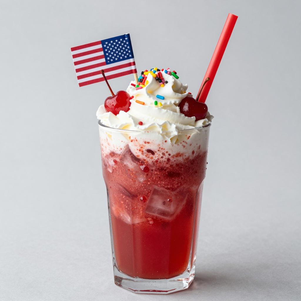 Glass of red frozen drink with ice cubes, topped with white whipped cream, red cherries, and sprinkled with colorful candy pieces. Small American flag flagstick with red straw in the whipped cream. Light grey background. Photographic style.