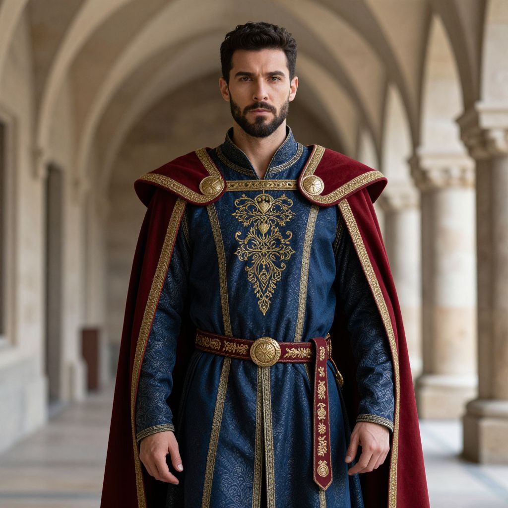 Photograph of a handsome, dark-haired man with a trimmed beard standing in a stone hallway. He wears an elaborate, medieval-style outfit featuring a deep blue tunic with gold embroidery, a red cape with gold trim, and a matching belt. His confident stance and serious expression add to his regal appearance. The background includes arches and columns, adding an ancient, castle-like vibe.