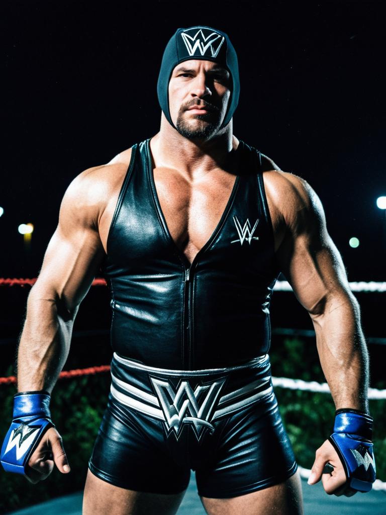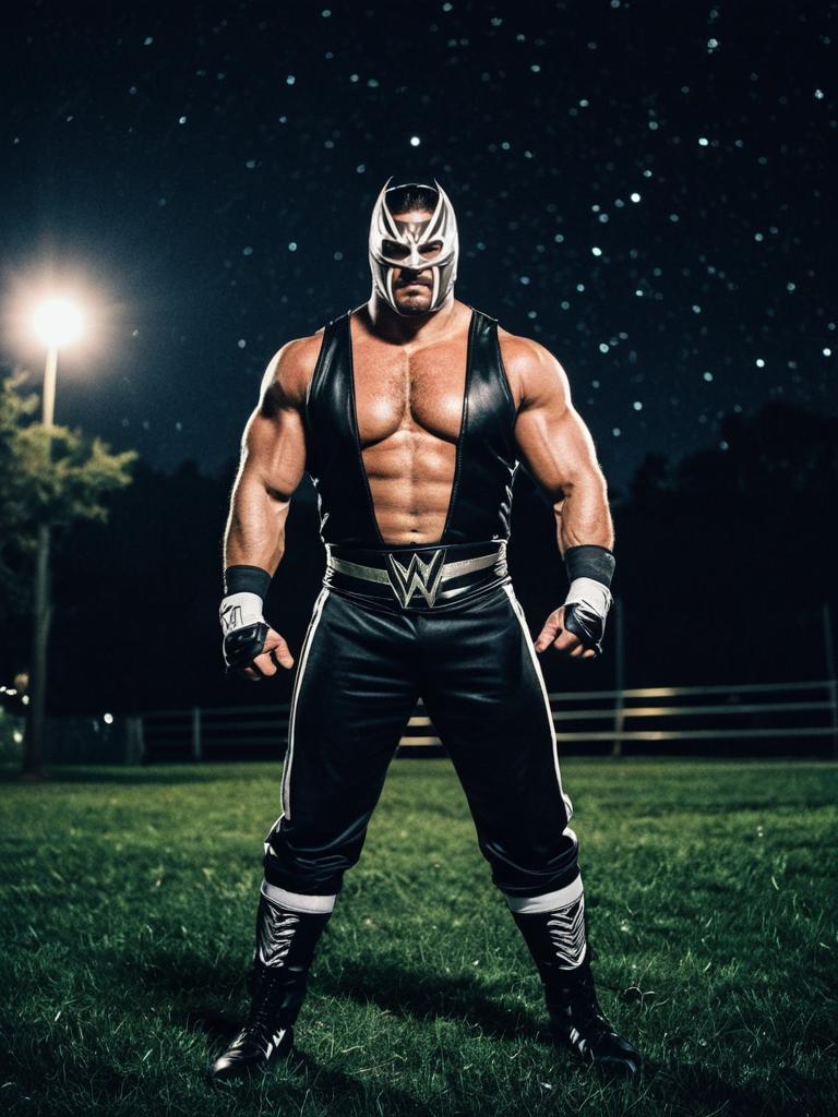 Man in WWE Fighter Costume, photorealistic outdoor portrait at night