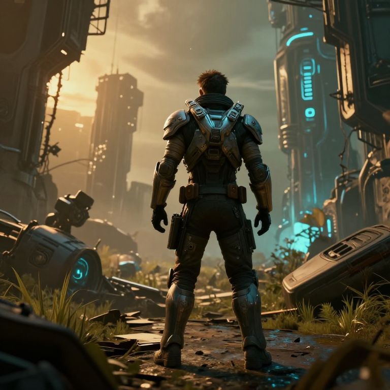Digital sci-fi artwork of a muscular, armored figure with a backpack, standing in a ruined futuristic city at sunset.