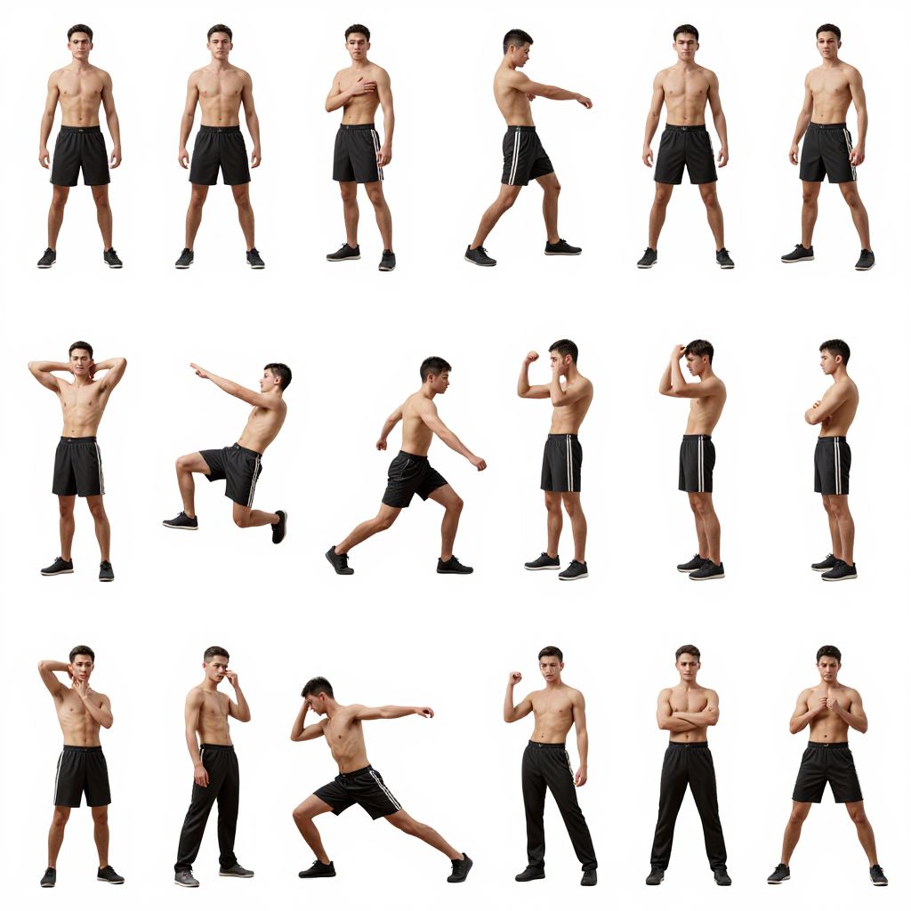 Pose reference database featuring a diverse collection of dynamic human figures in various action poses, high detail, full body, realistic anatomy, studio lighting, clear background for easy tracing and study.