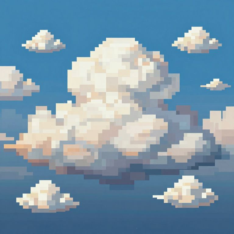 The image depicts a pixel art representation of a cloud formation, rendered in a vibrant and detailed style. The clouds are composed of numerous small, square pixels, creating a textured and layered effect. The central cloud is the most prominent, with a large, fluffy shape that appears to be billowing upwards. Surrounding this central cloud are smaller, scattered clouds of varying sizes and shapes, some of which are partially obscured by the larger formation. The colors used are primarily shades of white, gray, and brown, with subtle gradients that give the clouds depth and dimension. The background is a gradient of blue, transitioning from a lighter shade at the top to a darker hue at the bottom, which helps to emphasize the clouds. The overall composition is dynamic, with the clouds appearing to be in motion, creating a sense of depth and space within the image.