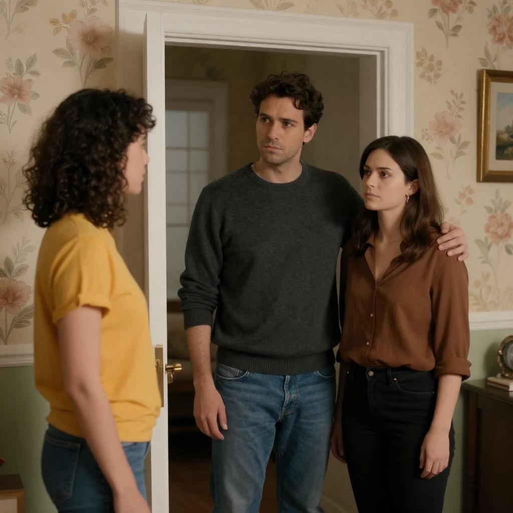 Photograph of a bedroom with two people. A man in a yellow shirt sits on the left, looking at the woman on the right. The woman has curly brown hair, wears a green top, and covers herself with a red blanket. They are on a bed with white pillows. The wall behind them has blue floral wallpaper and two framed pictures. The man's expression is neutral, the woman's expression is concerned. A window is in the background.