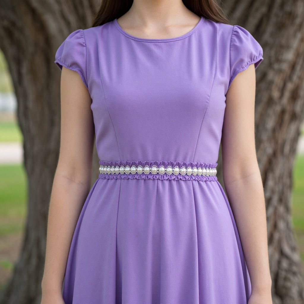 Lilac Princess Dress, a close up of a woman in a purple dress standing in front of a tree