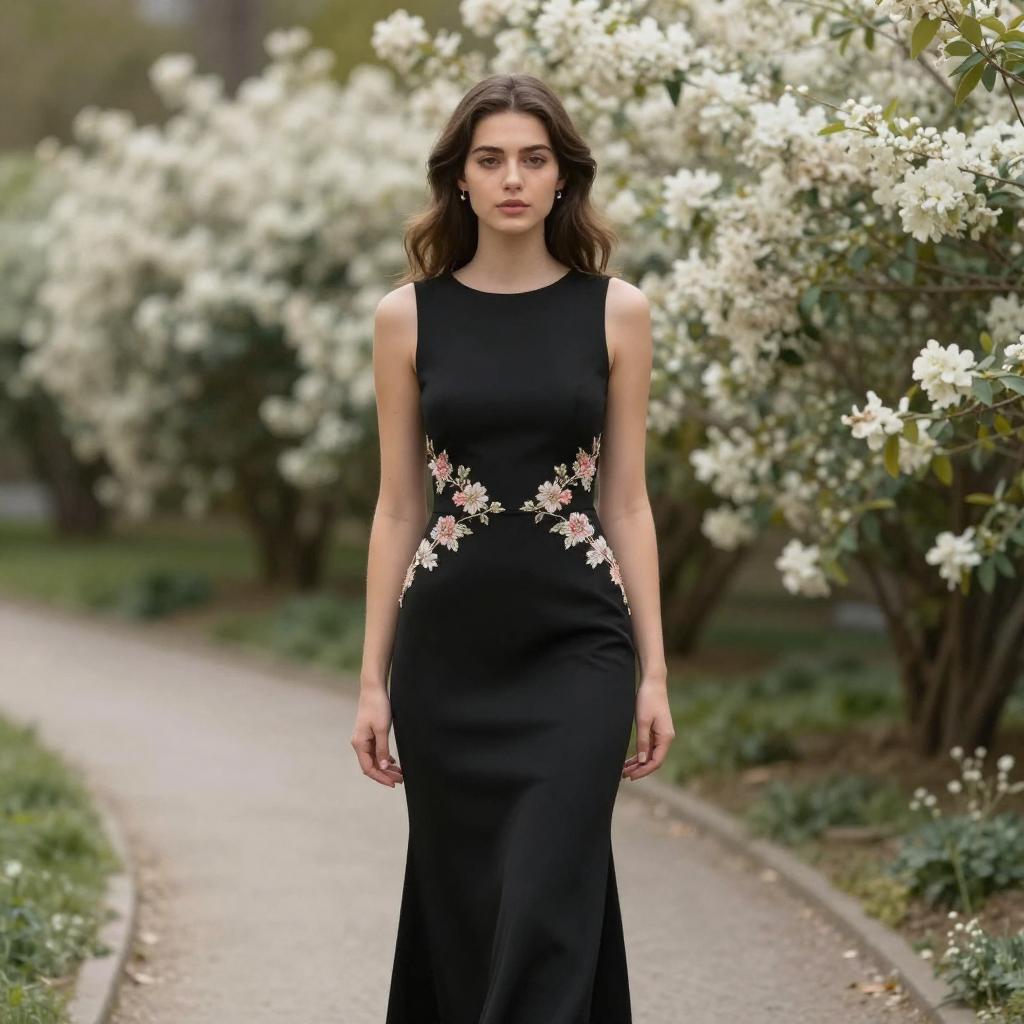 Photograph of a woman with dark hair, wearing a black dress and black shoes, standing in a spotlight on a marble floor. She stands centered, looking slightly to the right. A man in dark clothing stands on a staircase in the background. Soft light from a spherical lamp on the left casts shadows.