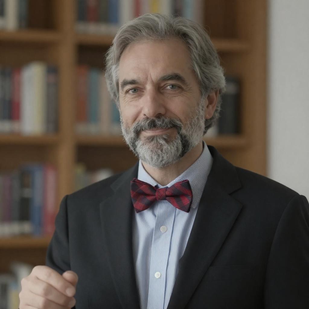 Photograph of a middle-aged man with light skin and short, neatly combed gray hair, smiling slightly. He's wearing a dark navy suit jacket over a white dress shirt and a striped tie in shades of gray and beige. The background is a rustic brick wall with varying brown and tan bricks, adding a textured, urban feel. The man's expression is friendly and approachable.
