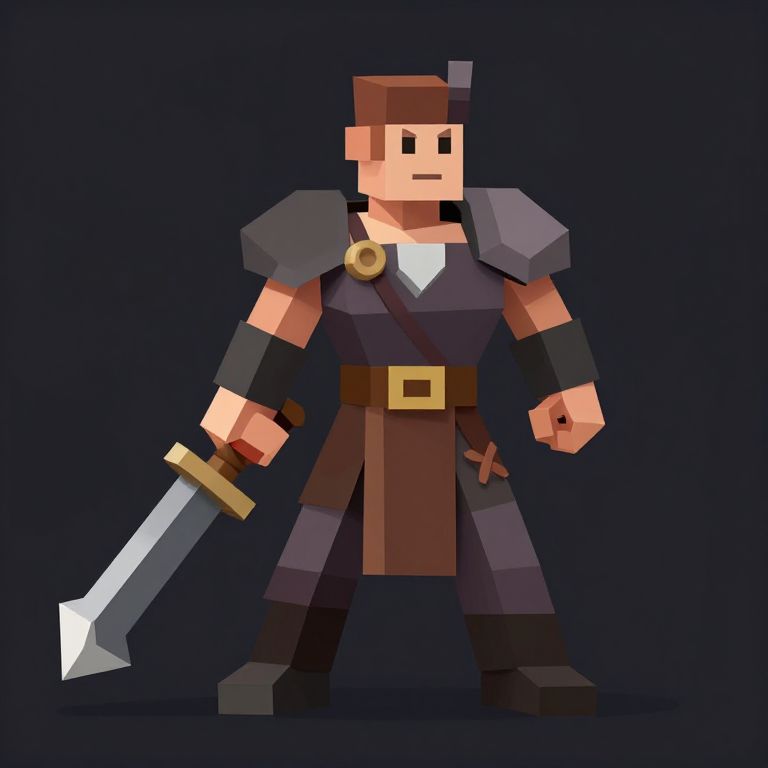 A pixel art image of a muscular, male warrior with a fair complexion and short brown hair, standing against a dark blue background. He wears a dark brown tunic with black shoulder pads, a white shirt underneath, black arm guards, and black boots. A brown belt with a gold square buckle is fastened around his waist, holding a sword with a large, white blade and gold hilt in his right hand. His expression is neutral, with simple black eyes and a small mouth. The style is reminiscent of 8-bit video game graphics.