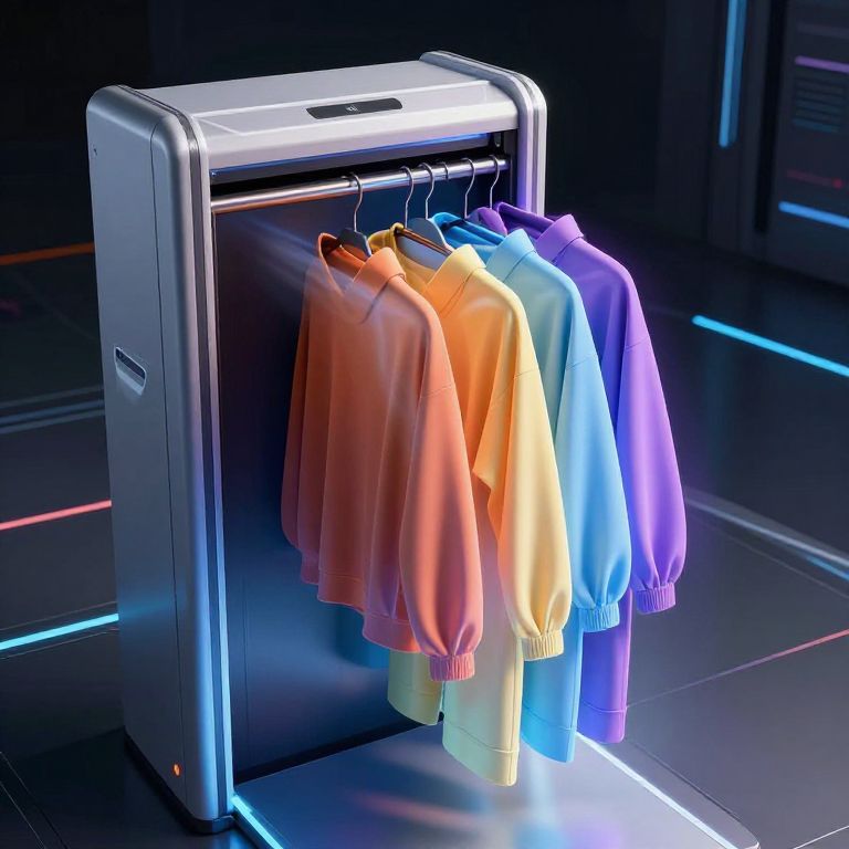 Photograph of a futuristic, illuminated clothing rack with four brightly colored, neon-lit, crew-neck sweatshirts hanging on hangers. The sweatshirts are orange, yellow, blue, and purple, each glowing with a vibrant hue. The rack is metallic and modern, with a built-in LED light strip at the top, casting a blue glow. The background is dark with subtle, multicolored light reflections on the floor, enhancing the futuristic aesthetic. The image has a high-contrast, sci-fi style, emphasizing the sleek design and vivid colors.