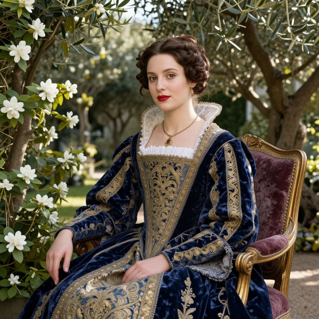 A refined Italian Renaissance lady with glowing skin, a serene expression, and full, red lips sits on an antique velvet chair in a luxurious palace garden. She is dressed in a rich, layered gown of deep blue velvet with gold embroidery, classic Renaissance elegance, and a high neckline that highlights her graceful neck. Flowering jasmine and olive trees surround her, with soft sunlight filtering through the canopy.