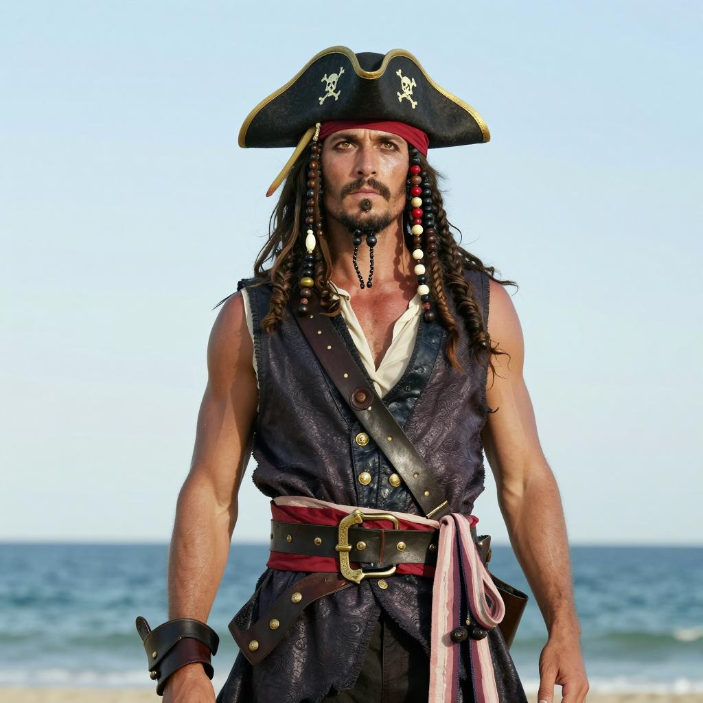 A man wearing a sleeveless pirate costume stands confidently in front of a sea backdrop under a clear sky. His outfit includes a black leather vest with gold buttons, a wide red sash belt, a leather cross strap, and a black tricorn hat decorated with white skull-and-crossbones symbols. He has braided hair adorned with colorful beads, embodying a traditional pirate look.