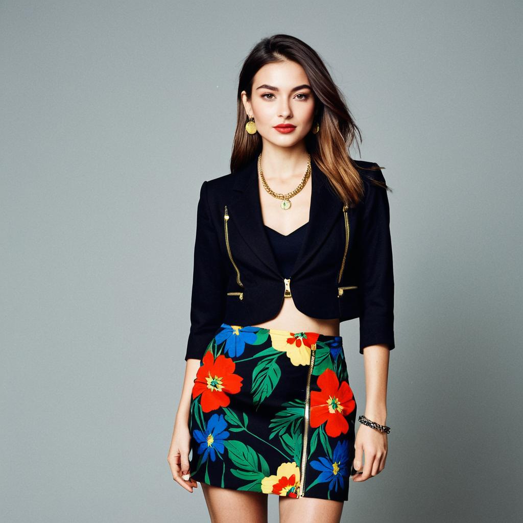 Woman, funky, black cropped blazer with bold floral print, colors in red, green, and yellow tones, three-quarter sleeves, lapel collar, paired with a royal blue mini skirt, high-waisted, asymmetrical hemline, visible zipper, midriff-baring black top underneath, delicate gold necklace, straight hairstyle.