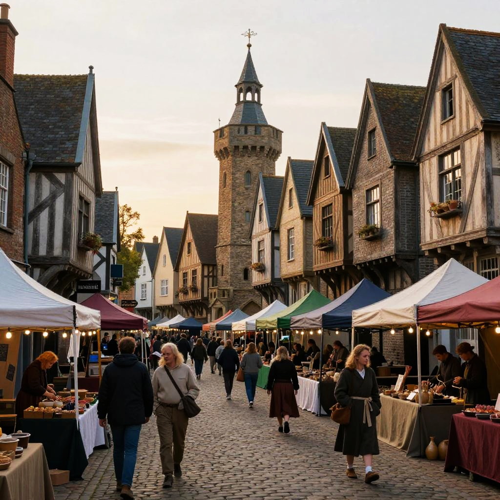 Morgans medieval-style fantasy town with cobblestone streets and timber framed buildings, bustling market scene with villagers and merchants, colorful tents, lively atmosphere, intricate architectural details, warm sunset lighting.