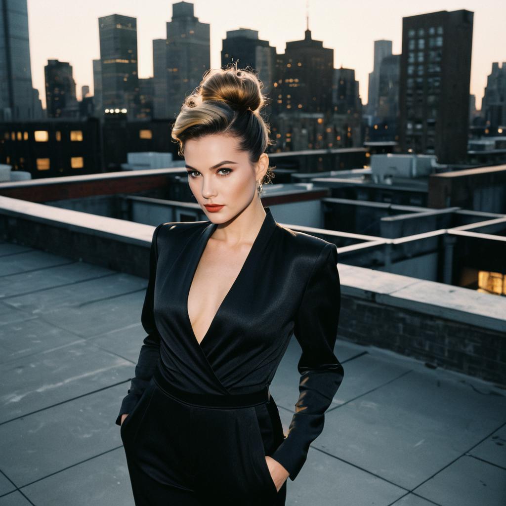 Fashion editorial style portrait of a woman with a twisted updo hairstyle, wearing a sleek black jumpsuit. She stands confidently on an urban rooftop at dusk with city skyline in the background, illuminated by soft glowing light. The model has fair skin, styled makeup with bold red lipstick, and wears statement earrings.
