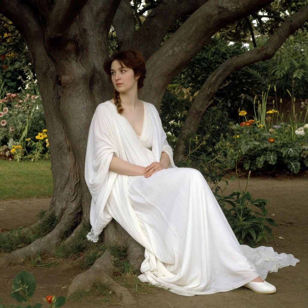 Woman seated gracefully in a flowing white gown, leaning against a gnarled tree trunk amidst a serene garden setting, evoking the classical elegance of Pandora, 1881, by Sir Lawrence Alma-Tadema.