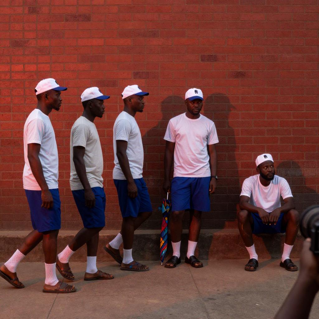 Photograph of five African men in urban setting. Red brick wall background. Four men walking left, one man sitting right, wearing white hats and shirts, blue shorts, white socks, and shoes. Umbrella with colorful pattern on ground. Shadows cast on wall. Intense red lighting. Two men with intense expressions. Photographer's in bottom right.