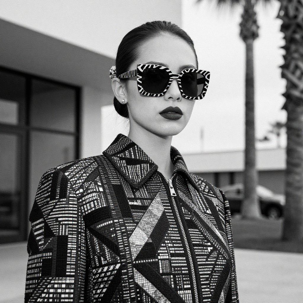 Black-and-white photograph of a sleek, dark-haired woman in patterned plaid jacket and stylish, zigzag-patterned sunglasses, standing outdoors by a