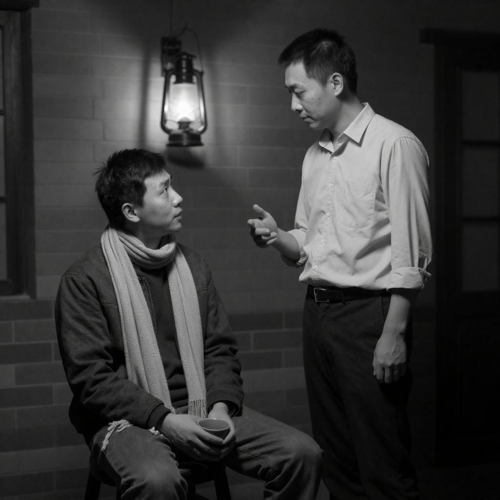 Photograph of a dimly lit underground corridor with red carpet. A man with a ponytail, wearing a white shirt and black pants, leans against the left wall. Another man, in a dark shirt and pants, stands opposite, gesturing with his right hand. Bright lights illuminate the corridor's right side, creating a stark contrast.