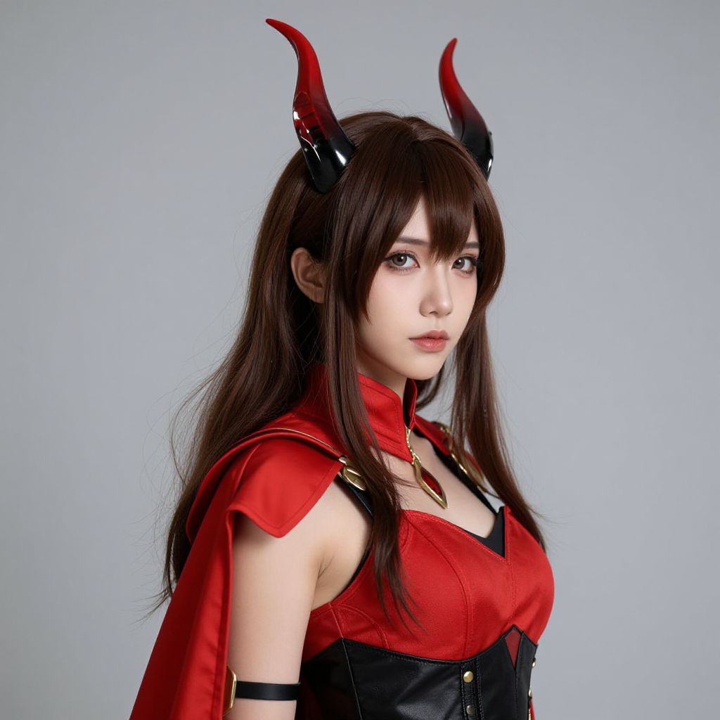 Woman with long brown hair and horns on her head, wearing a red and black costume with a red cape.