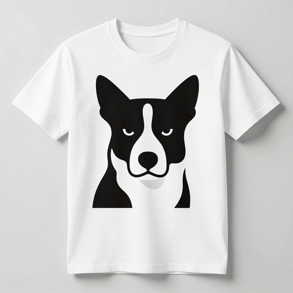 This photograph depicts a white, short-sleeved T-shirt with a black and white digital illustration of a dog's face on the front. The dog's face is stylized with bold black and white shapes, featuring a prominent black patch over the left eye and a white stripe running down the nose. The dog's expression appears neutral or slightly serious. The T-shirt is laid flat against a light gray background, and the edges of the shirt are slightly crumpled. The illustration is minimalist, with clean lines and a modern, graphic design style.