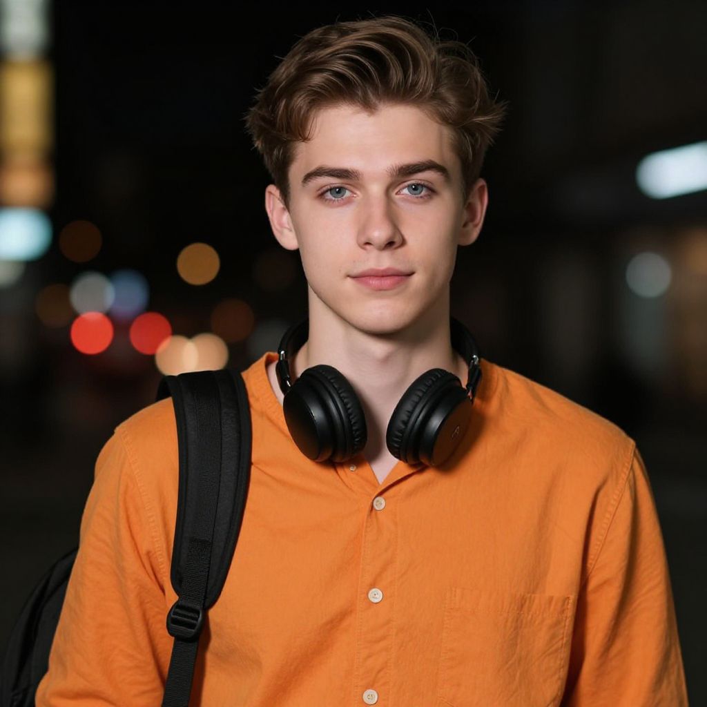 Photograph of a handsome young man with light skin, brown hair styled neatly, and blue eyes. He's wearing a bright orange button-up shirt and black headphones around his neck, with a black backpack strap on his right shoulder. The background is blurred with dark, colorful city lights, giving a nighttime urban vibe. He's looking directly at the camera with a slight smile.