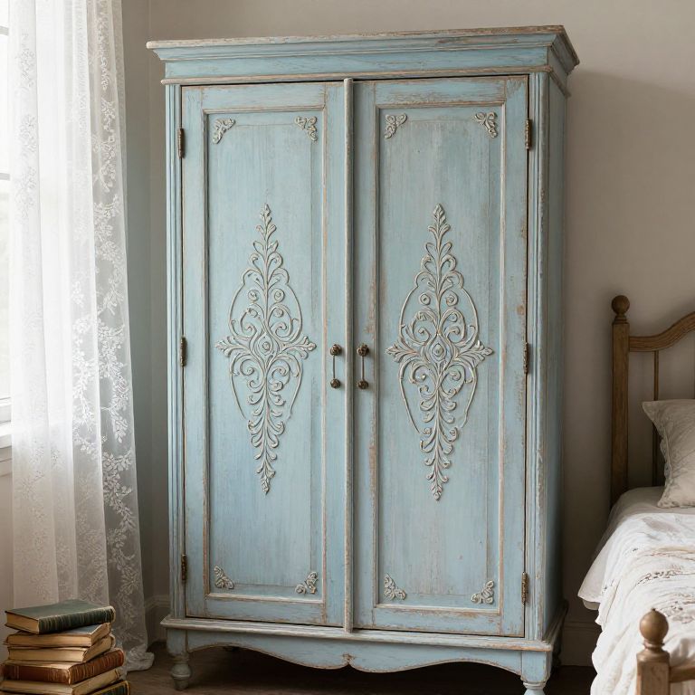 Vintage-style, distressed blue wooden wardrobe with ornate floral carvings on double doors, beside a bed with white lace curtains.