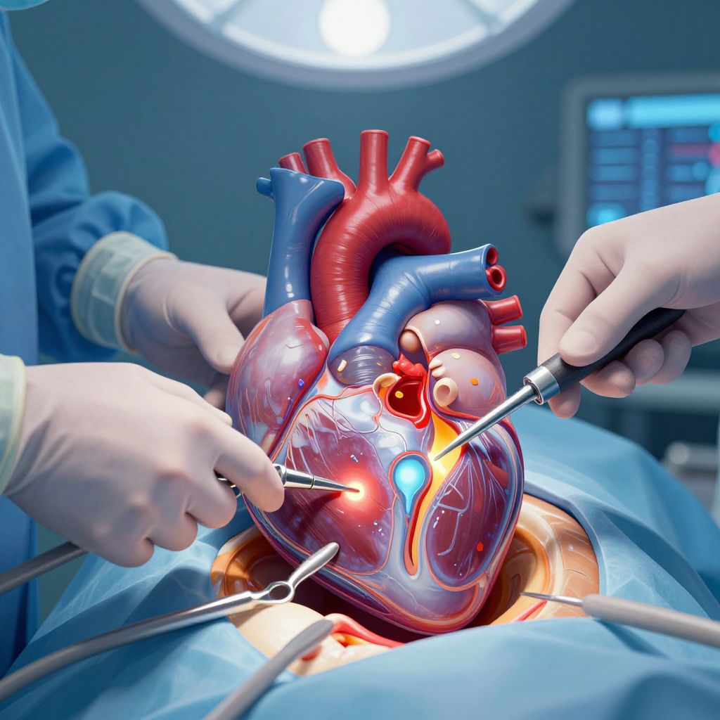 Surgery illustration showing detailed anatomy of the human heart being operated on, precise incisions, glowing surgical instruments, surgeon’s hands with gloves, illuminated operating theater background, medical futuristic art style with vibrant blue and red tones