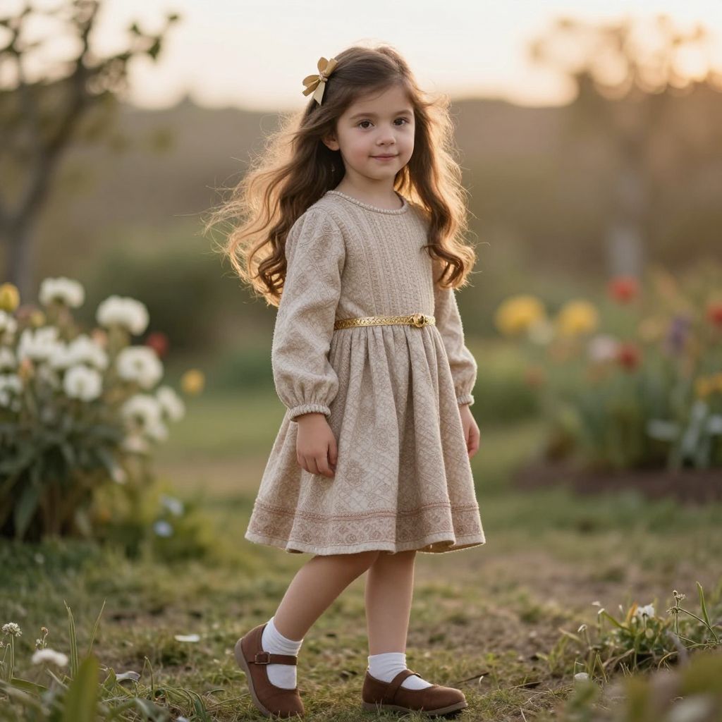 A beautiful young girl with soft brown hair, gently flowing in the breeze, wearing a stylish green dress with intricate gold buttons along the sleeves and neckline. She has a cheerful expression and bright eyes, sitting on a sunny meadow with wildflowers surrounding her. A delicate green bow is tied neatly on top of her head, adding a touch of elegance and charm. The scene is painted in warm, natural lighting with a serene and peaceful atmosphere.