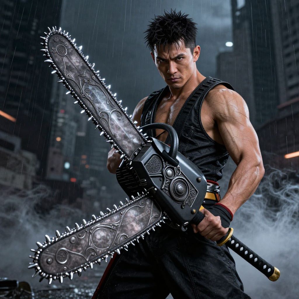 Katana devil chainsaw man cosplay in realistic photo style, cinematic scene with low lighting and smoke, ultra-detailed rendering of the chainsaw and katana, intricate metal textures, glowing edges of weapons, dark rainy city background, realistic skin and clothing wrinkles, sharp focus, dramatic shadows, hyper-detailed rendering.