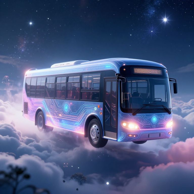 Magic bus AI traveling across a surreal dreamscape, floating over clouds and shimmering stars, mystic landscapes blending nature and technology, ethereal glow around the bus, intricate circuit patterns visible on the vehicle's surface, fantasy meets advanced AI aesthetics.