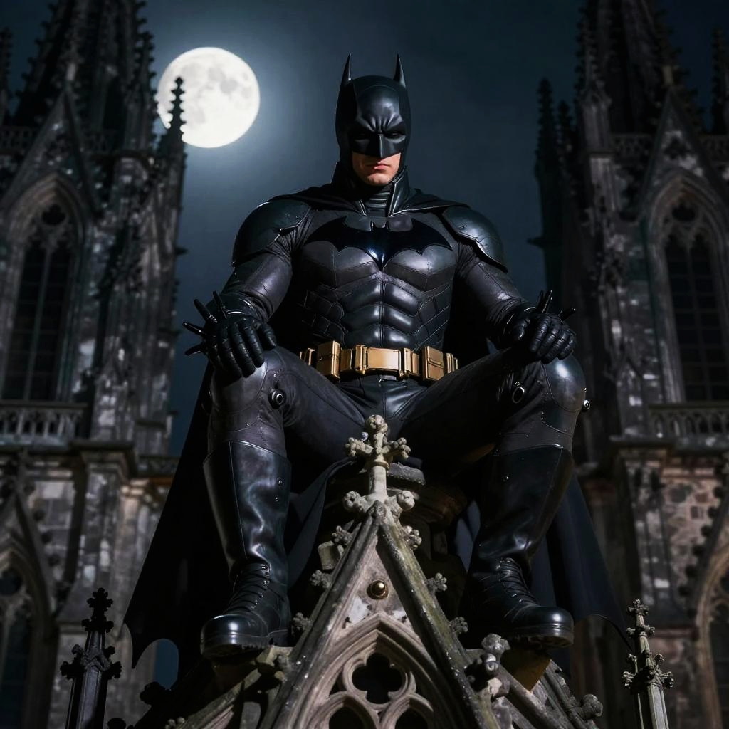 Andrew Tate Batman fusion, brooding vigilante, perched on gothic cathedral top, moonlight casting sharp shadows, detailed batsuit with sleek tech enhancements, dark and moody palette