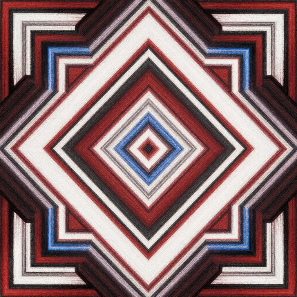 This image is a digital, abstract pattern with a symmetrical, geometric design. It features a diamond-shaped center with intricate, layered lines and shapes in red, white, black, and blue. The outer edges are filled with a repetitive, linear pattern, creating a sense of depth and complexity. The overall style is reminiscent of Native American or Southwestern tribal art.