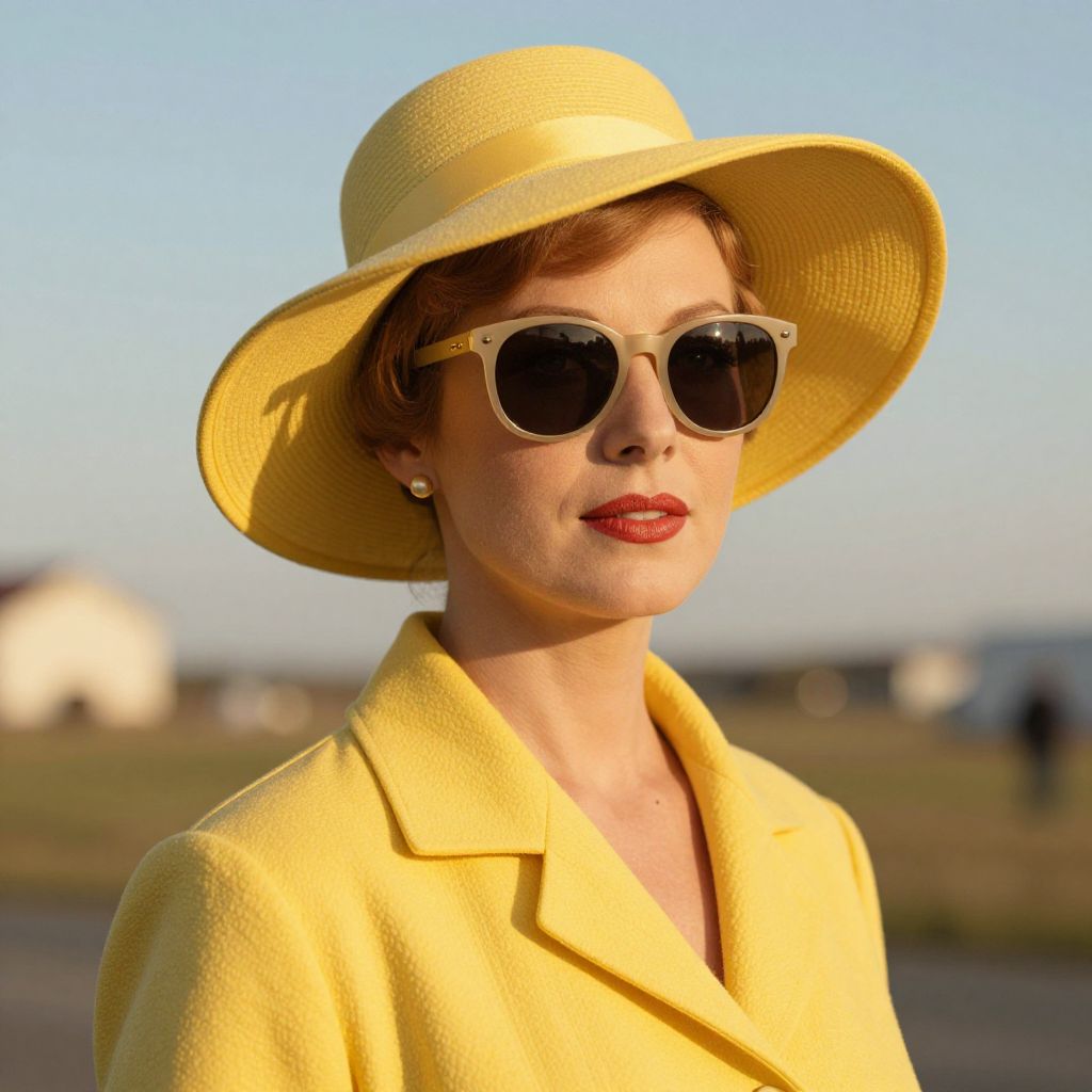 Photograph of a fair-skinned, red-haired woman in her 30s with a slender build, wearing a bright yellow wide-brimmed hat, large round sunglasses with beige frames, and a matching yellow textured coat. She has red lipstick and small pearl earrings. The background features a blurred outdoor setting with a clear blue sky, distant white buildings, and a grassy field. The sunlight casts a warm glow, enhancing the vivid yellow of her outfit. Her expression is calm and confident.