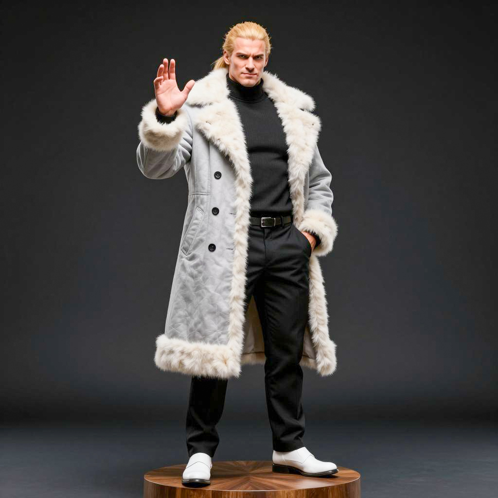 Tall, muscular blond man with hair tied in a ponytail wearing a long light gray coat with white fur trim. He has a black turtleneck, black pants, white shoes, and a black belt. His right hand is raised with fingers slightly spread, and his left hand is in his pocket. He stands on a round wooden base against a solid black background with a confident expression and slight smirk.