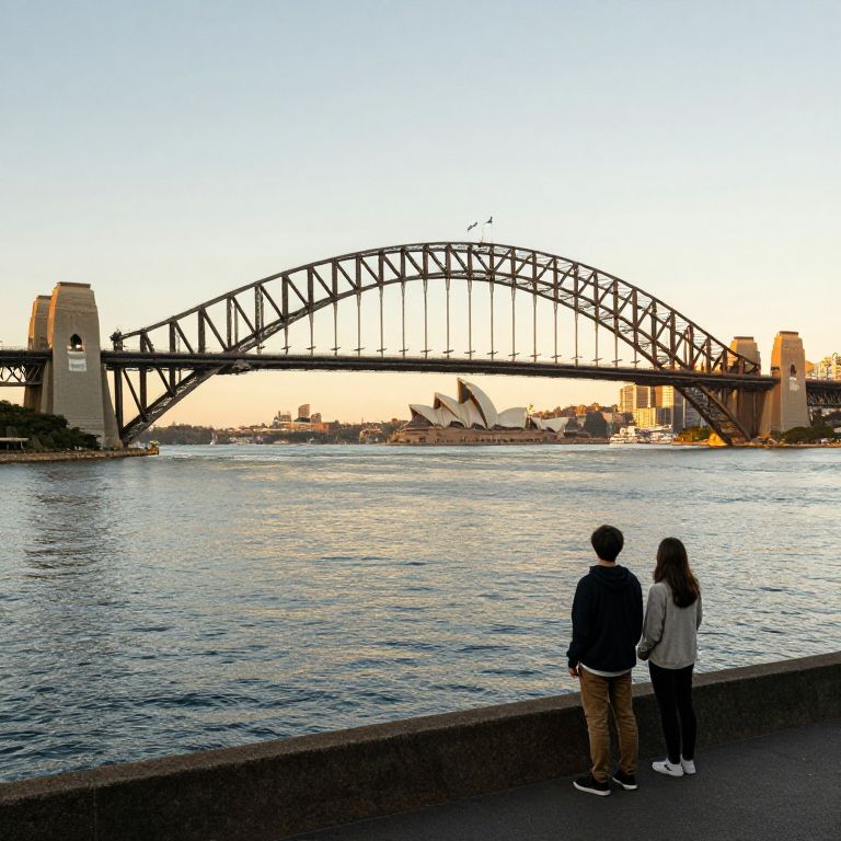 A wide-angle photograph of the Sydney Harbour Bridge at golden hour, with the bridge's iconic arch glowing in warm sunlight, reflecting on the calm waters of Sydney Harbour. A young couple in casual clothing stands on the bridge's western side, facing the harbour, with the harbour bridge's northern towers and the Opera House in the distance.