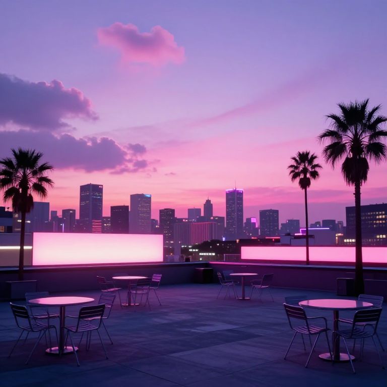 Liminal space vaporwave rooftop at dusk, pastel colored clouds blending with neon city skyline, scattered empty chairs and tables, large glowing horizons, palm trees silhouetted against pink and purple skies, nostalgic 80s synthwave vibe with surreal, dreamlike emptiness.