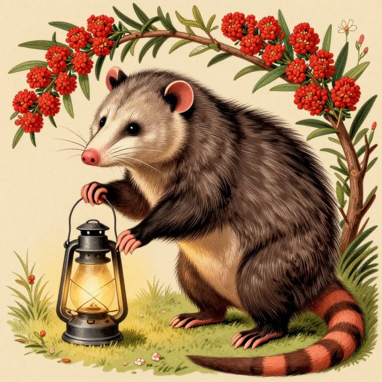 Illustration of a possum with black and brown fur, pink nose, and striped tail, holding a lantern under a red berry bush.