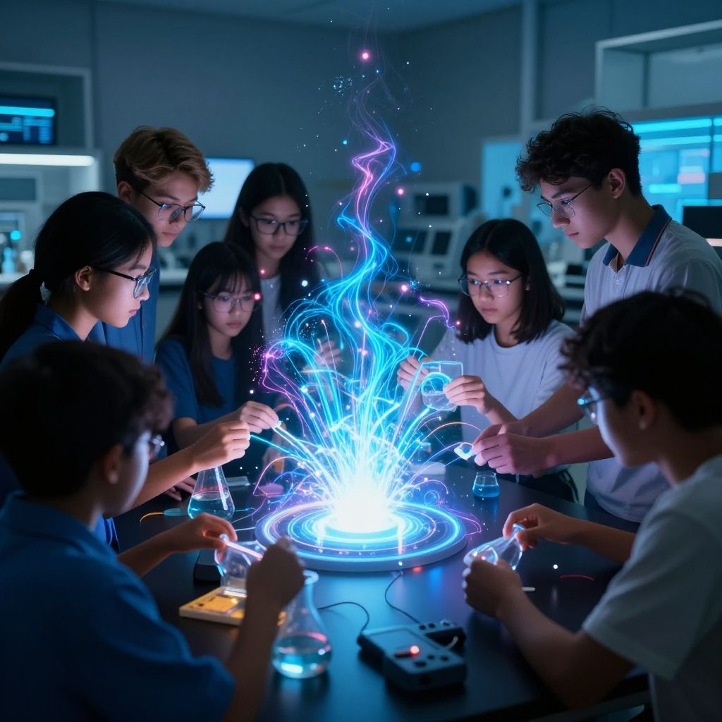 Student exploration diffusion scene, diverse group of students collaboratively experimenting with glowing technology in a high-tech lab, dynamic energy and light diffusion effects