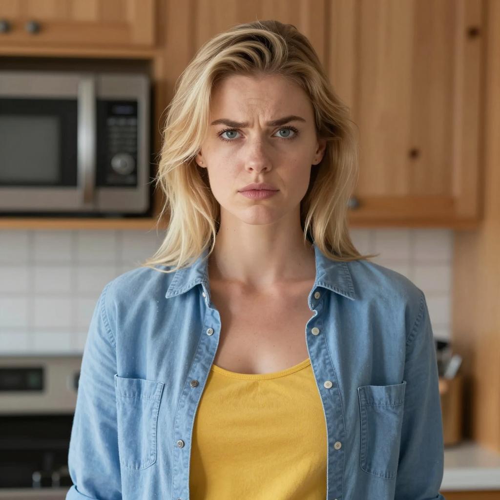Blonde woman with curly hair in a blue striped bathrobe holds a banana in her right hand. She stands in a cluttered kitchen with teal curtains, sunlight filtering through blinds. Countertops have dishes, a yellow cup, and a horse figurine. She looks down at the banana. Background includes shelves with decorative items and a mirror. Kitchen has a messy, lived-in feel. Two windows with blinds are visible. One person.