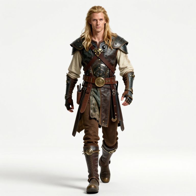 Embrace Full body front portrait view of a cyberpunk and slightly steampunk version of Legolas walking, with natural studio lighting, on a plain white background.,