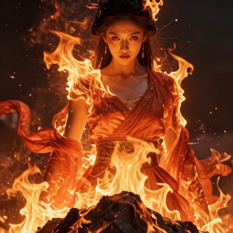 Photograph of an Asian woman with long black hair, wearing an ornate, red, traditional Chinese dress with gold embroidery, standing amidst a large, bright orange fire. Her face is illuminated by the flames, highlighting her intense expression and delicate features. The fire surrounds her, with flames dancing and flickering, creating a dynamic, dramatic atmosphere. The background is dark, emphasizing the brightness of the fire and the woman's glowing appearance. The texture of the flames contrasts with the smooth fabric of her dress, adding depth to the image.