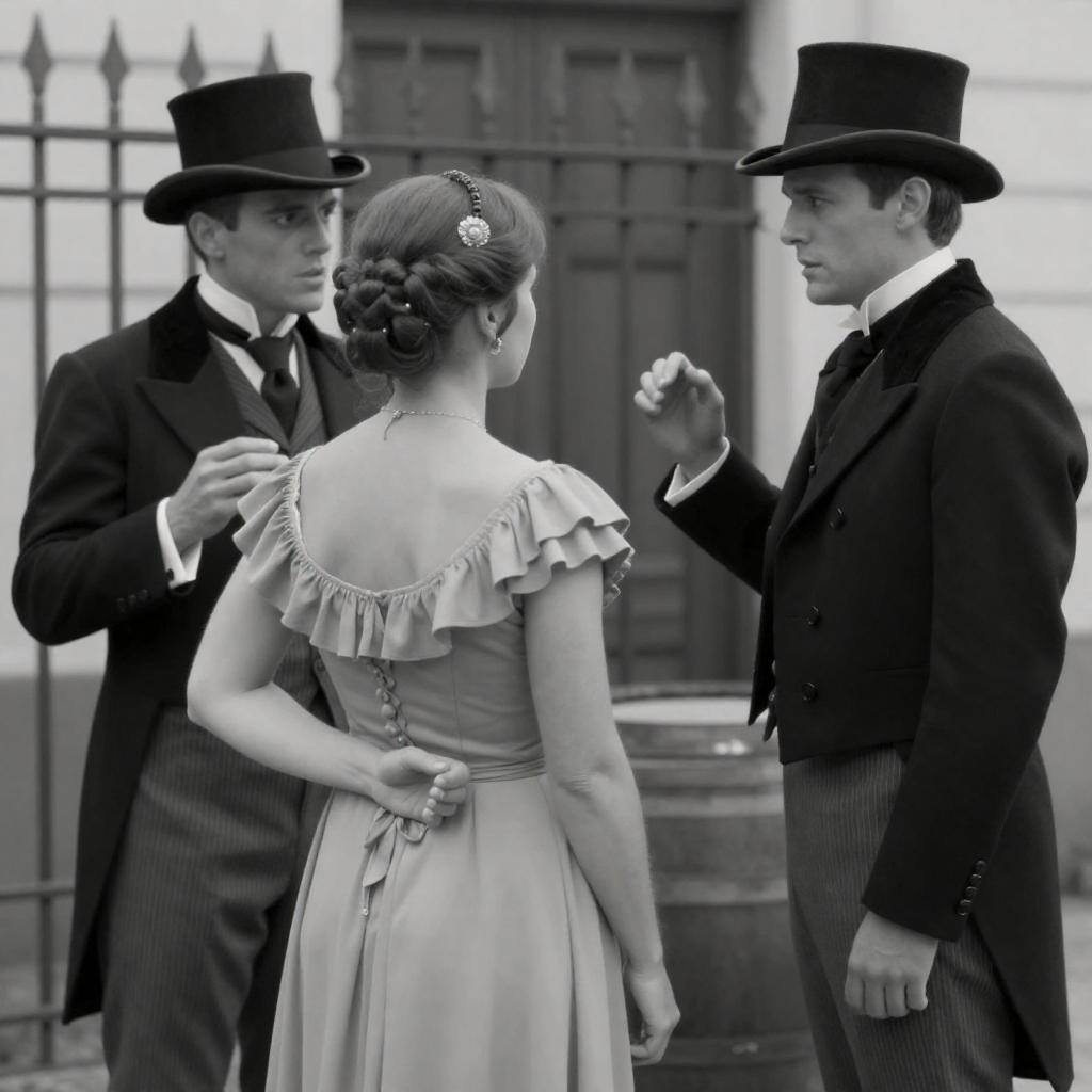Black-and-white photograph of three people. Woman in frilled off-shoulder dress with flowered hair, facing two men in top hats and black coats. Man on left gestures, man on right looks at woman. Iron gate and barrel in background. Woman's hands on waist. All three have intense expressions.